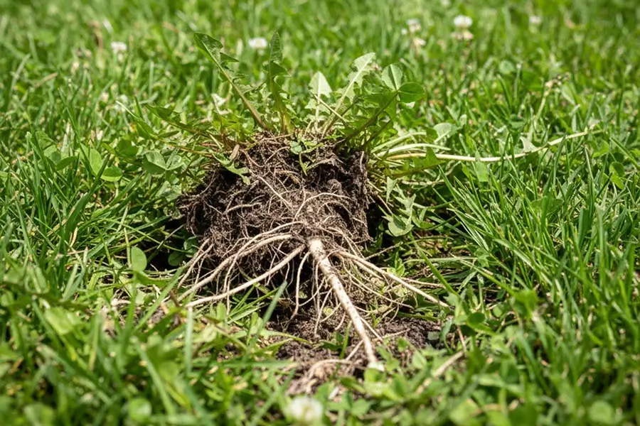 Dense root mats often belong to weeds, not healthy turf.